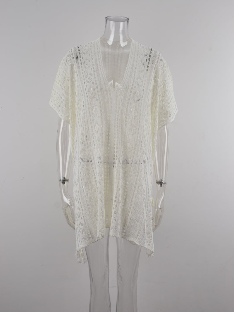 Fringe Trim Dolman Sleeve Openwork Cover-Up