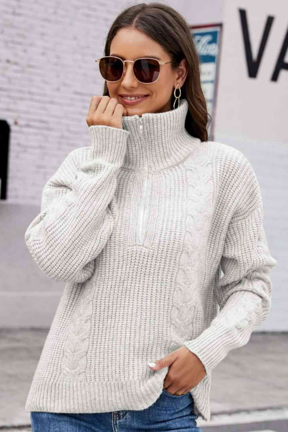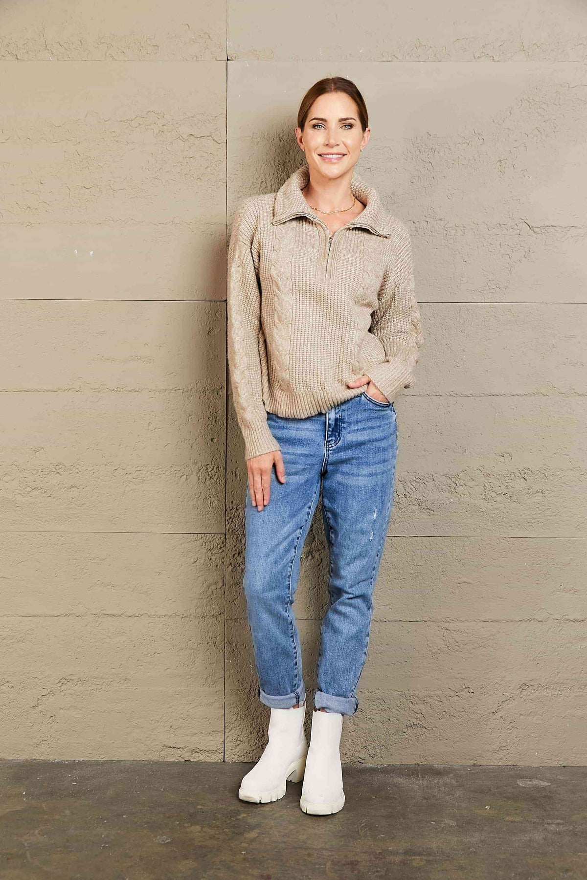 Woven Right Half Zip Mixed Knit Collared Sweater