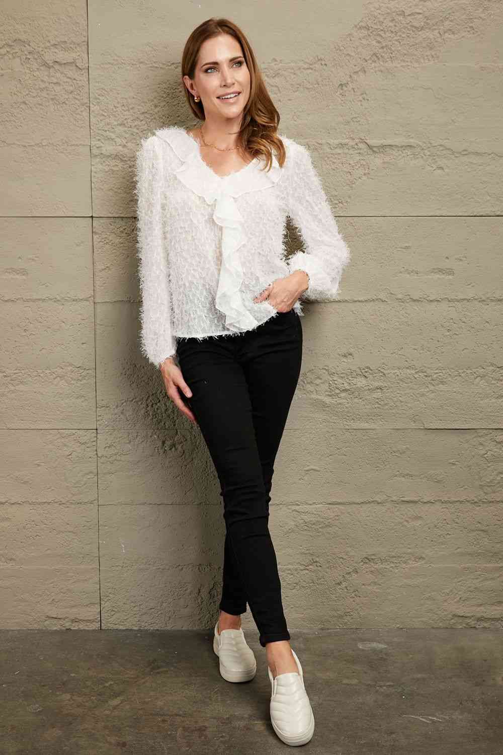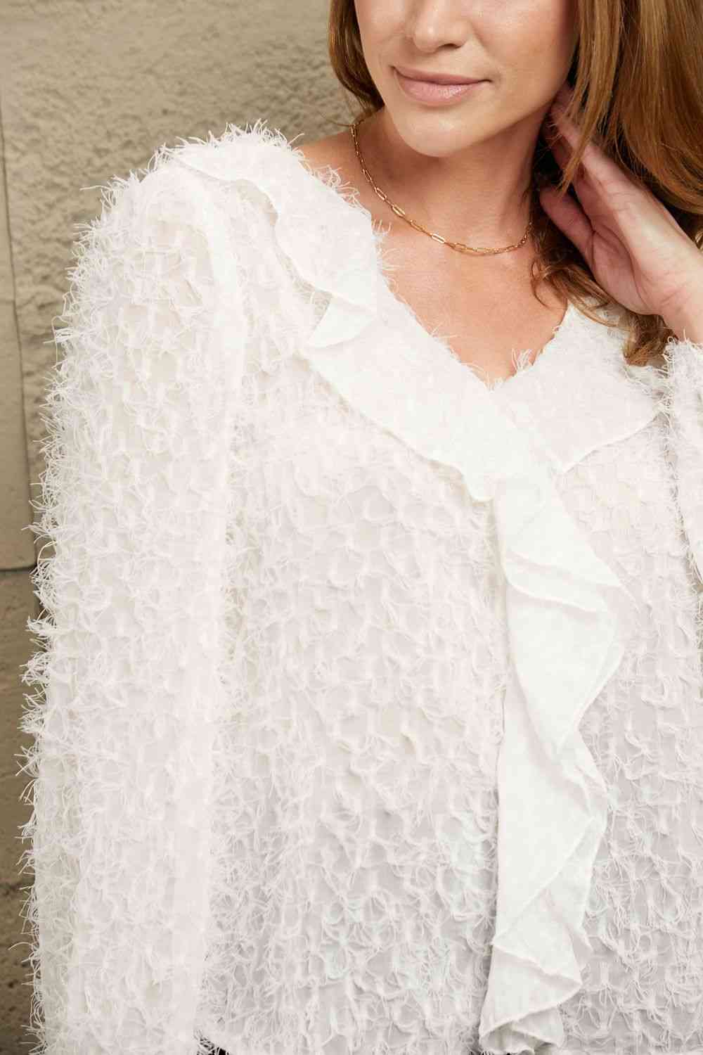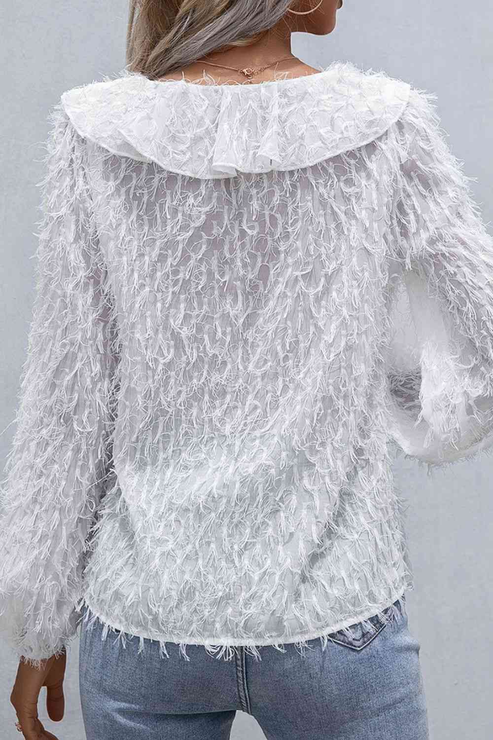 Double Take Ruffle Hem Fringe V-Neck Balloon Sleeve Blouse